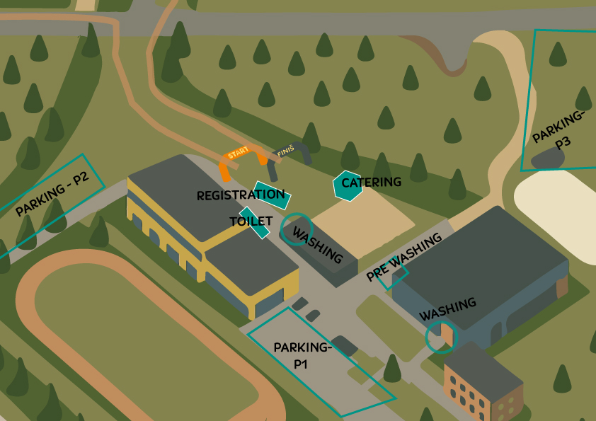 After the race, washing facilities will be available in the wrestling house (a small blue building right next to the competition center) and in the sports hall. There are also toilets in these buildings in addition to the outdoor toilets.