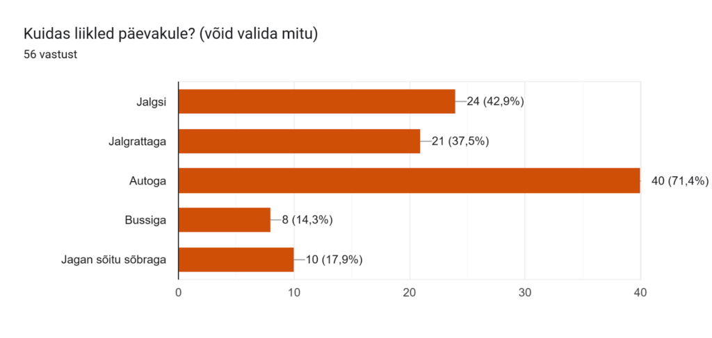 Kõige populaarsem liiklemiseks on siiski auto. Samas võib rõõmustada, et nii mõnigi on märkinud, et liikleb jalgsi või jalgrattaga päevakule!