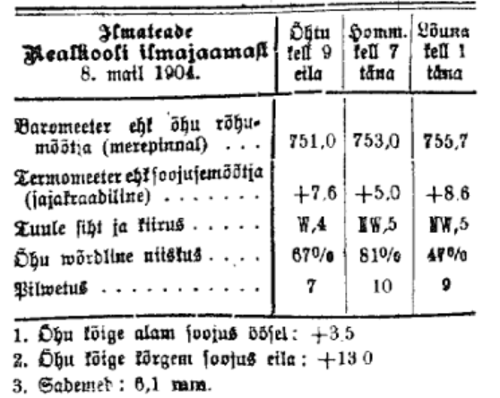 Weather information from the Dorpater Realschule weather station in the Postimees on 8 May 1904