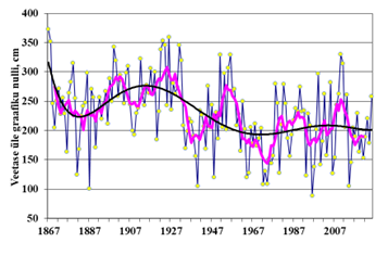 The long-term variation in the highest spring flood water level of the river Emajõgi in Tartu from 1867–2025. The dashed line indicates the long-term average (229 cm above the zero point), the bold line represents the 7-year moving average. The wave-shaped line is a sixth-degree polynomial that summarises the long-term dynamics of the water level.